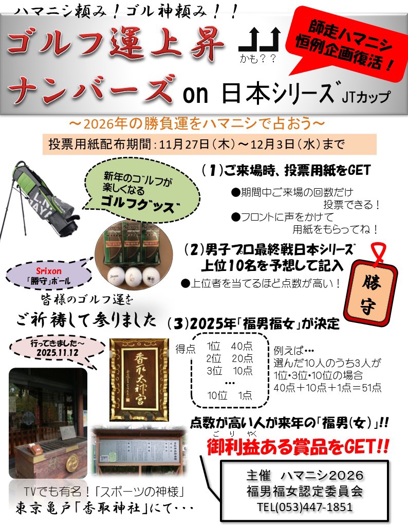 練習場・ショートコースご利用のお客様に 1日1枚、投票用紙をお配りいたします。